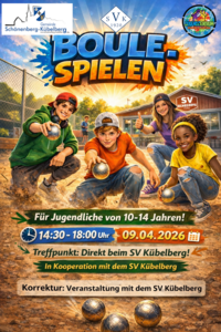 Am 09.04.2026 treffen wir uns um 14:30 Uhr, mit den 10-14 jährigen beim SV Kübelberg zum Boule spielen, um 18.00 Uhr können die Kinder dort wieder abgeholt werden.