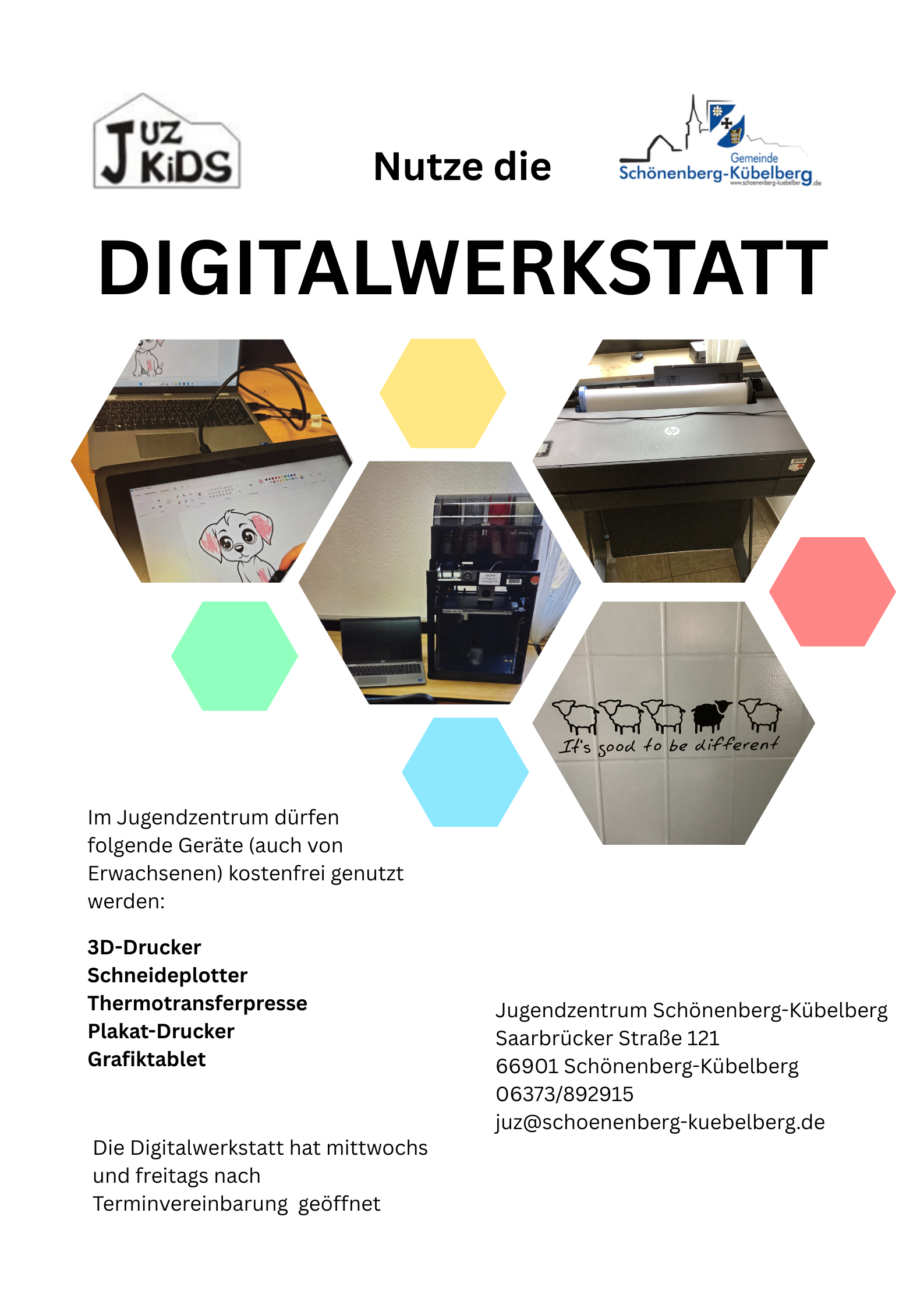 Unsere Digitalwerkstatt mit dem Schwerpunkt „Kreativität und Bildung“ hat einen 3D-Drucker, einen Plotter zum drucken von Plakaten, Sublimationsdrucker, Heißpresse, Grafiktablet, Mikrofon zum aufnehmen von Musik und ein kleines Fotostudio.